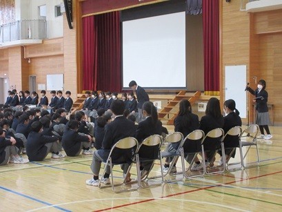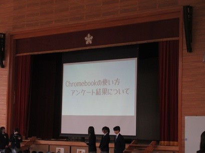 各委員会と部活より報告等がありました。また、生徒会によるChromebookについての生徒アンケートを行った結果を発表していました。区から貸与されている端末を大切に、そして学び・学習のために使っていきましょうとの呼びかけがありました。