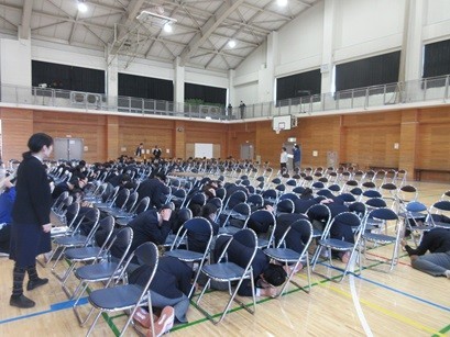 また、予行後には体育館にいる時に地震が発生したことを想定した安全確保と避難指示・経路の確認をしました。
