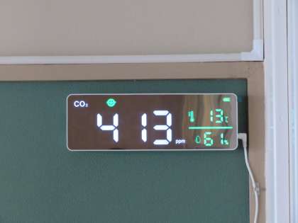 各教室にCO2濃度測定器を設置しました。CO2濃度をリアルタイムに測定し、モニタで見える化することで、効率的な換気をするためです。
