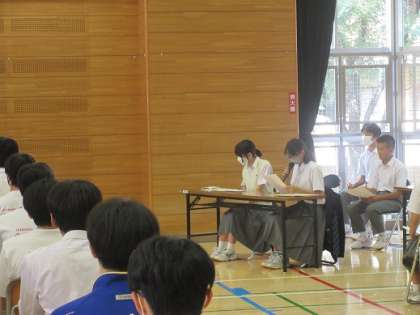 生徒会役員選挙 公開日 2023/09/15 更新日 2023/09/15 できごと 9月15日(金) 生徒会役員選挙の立ち会い演説会が行われました。その後各クラス で投票が行われました。結果よりも候補者が話してくれた思いと、 応援演説をしてくれた生徒から、立候補した生徒が普段から積極的に 皆のために頑張っている様子が伝わり、皆のために立候補してくれた ことにあらためて感謝です。