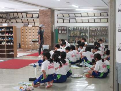7年生の体育授業の様子です。校庭での活動を終えて、日陰での