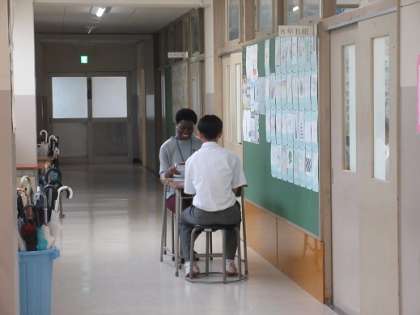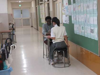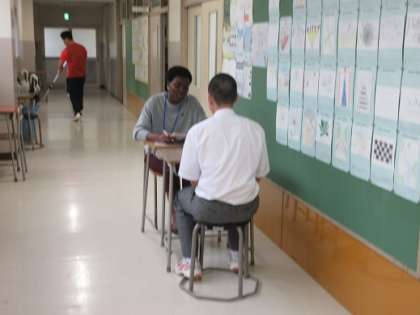8年生の英語授業でALTとのスピーキングテストの様子です。
