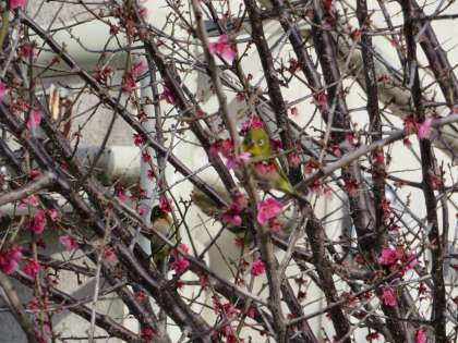 校庭の梅の木にウグイスが2羽とまっていました。