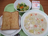 ○牛乳○アーモンドトースト○イタリアンドレッシングサラダ○コーンシチュー