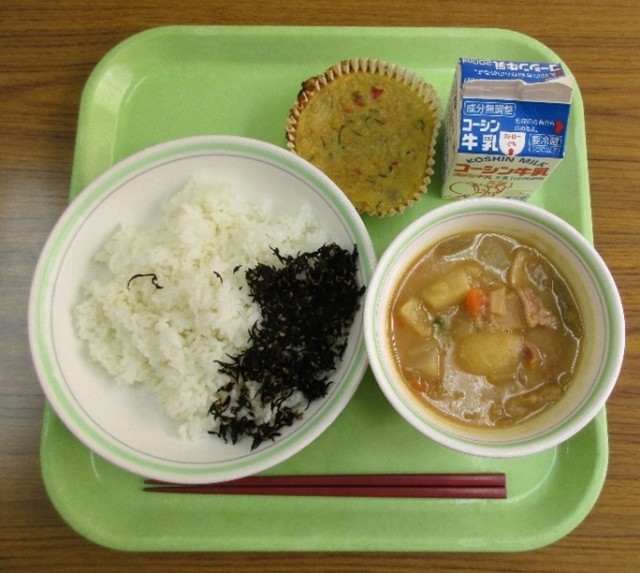 10月28日 給食 公開日 2025/10/28 更新日 2025/10/28 給食献立 今日のひじきふりかけは、みそ肉じゃがのだしをとったかつお節を使って作りました。かつお節をひじきなどの他の材料と一緒に釜で炒って、味付けをしました。調理の手間は増えますが、料理に活用して食べることで食品ロス削減につながります。