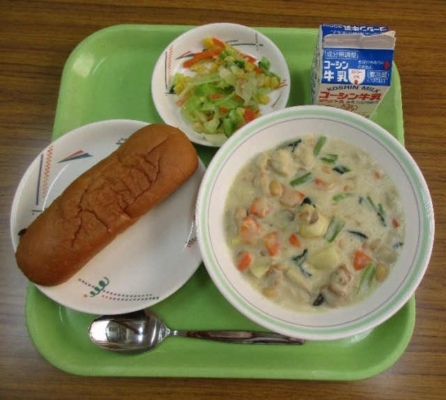 きのこのクリーム煮には、マッシュルーム、しめじ、エリンギ、えのきの4種類のきのこが入っています。きのこには、食物繊維や、ビタミンDなどが豊富に含まれています。食物繊維は、人の消化酵素では消化されない成分ですが、便の量を増やしたり、腸の動きを促したりして、おなかの調子を整える働きがあります。ビタミンDは、腸内でカルシウムの吸収を助ける働きがあり、丈夫な骨の形成に欠かせない栄養素です。