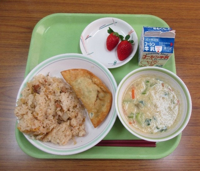 今日の主食は、キムタクごはんです。あの有名人がごはんになった!というわけではありません。キムチとたくあん、お肉が入った混ぜごはんのことで、長野県塩尻(しおじり)市のメニューです。漬け物が有名な長野県で、子どもたちに少しでも多く漬物を食べてほしいという思いから、子どもたちが好きな豚キムチを合わせたらおいしくなるのではないかという発想からできたそうです