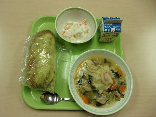 うぐいすきな粉揚げパン ワンタンスープ フルーツヨーグルト