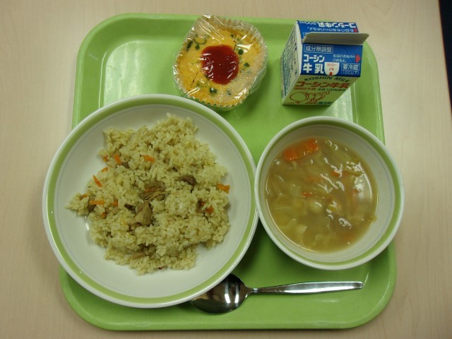 今日(きょう)はスペインをイメージした給食(きゅうしょく)(つく)りました。スペインでは、パンを主食(しゅしょく)にすることが多い(おおい)ですが、パエリア(ぱえりあ)をはじめ、(こめ)料理(りょうり)()べられています。パエリアは、炒めた(いためた)(にく)魚介類(ぎょかいるい)野菜(やさい)などの具材(ぐざい)に、(こめ)とスープを加えて(くわえて)炊き込(たきこ)んだ、スペインのバレンシア地方(ちほう)発祥(はっしょう)(こめ)料理(りょうり)です。また、スパニッシュオムレツの「スパニッシュ」とは、「スペイン(ふう)」という意味(いみ)で、スペイン料理(りょうり)の「トルティージャ」を参考(さんこう)(つく)っています。トルティージャとは、フライパンで平ら(たいら)丸く(まるく)焼いた(やいた)スペインの(たまご)料理(りょうり)です。使用(しよう)する具材(ぐざい)は、家庭(かてい)によってさまざまですが、じゃがいもが使われる(つかわれる)ことが多い(おおい)です。よくかんで味わって(あじわって)()べましょう♪