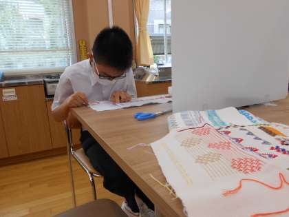 7組家庭科では、赤一中伝統の「スウェーデン刺繍」づくりに励んでいました。自分の好みに合った色の布に、丁寧に糸を縫い合わせていきました。大きさ、形、配色、デザインの組み合わせは多様にあり、世界に1つだけの宝物のように製作していました。
