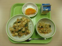 【献立】 ごはん あじのピリ辛ソース わかめともやしの卵スープ パイン缶 牛乳 ...