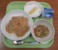 ドライカレーには鉄を含む「レンズ豆」、サラダには「小松菜」を使いました。給食ではいろいろな種類のカレーが登場しますが、赤一中のドライカレーは水分を加えずに作ります...