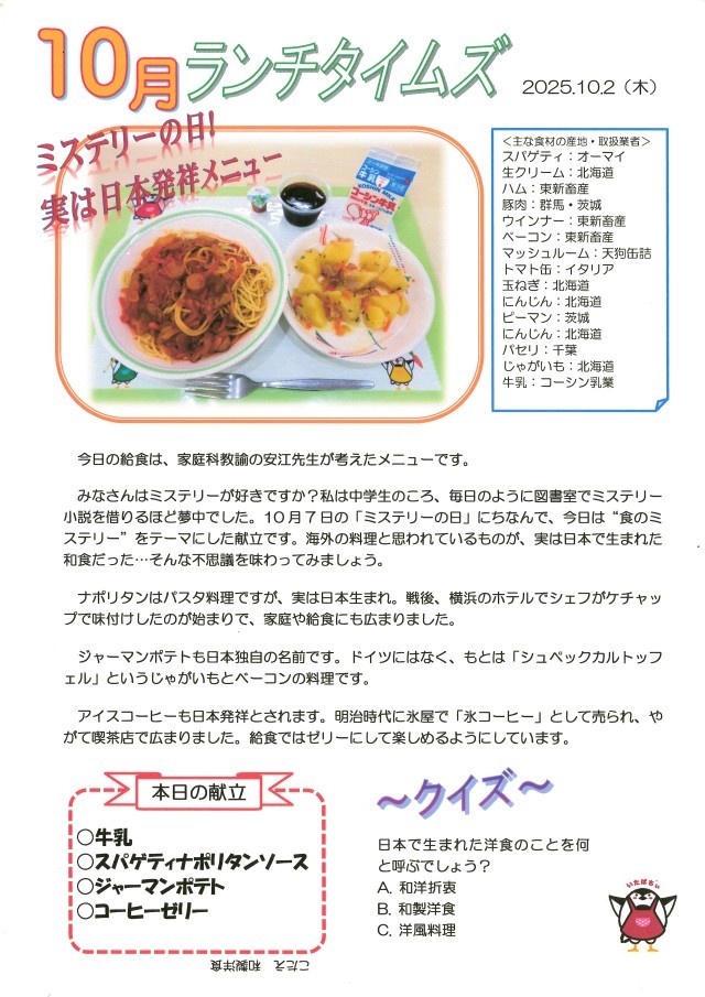 家庭科教諭安江先生考案メニュー「ミステリーの日!実は日本発祥メニュー」