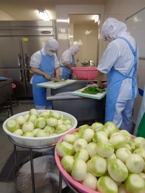 「スパゲティナポリタンソース」「ジャーマンポテト」の玉ねぎ合わせて約80kg。全てスライスします。