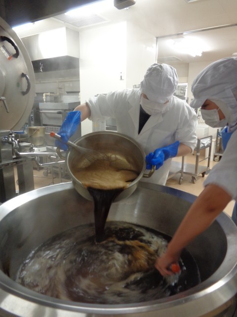 「コーヒーゼリー」釜でゼリー液とコーヒーを合わせます。