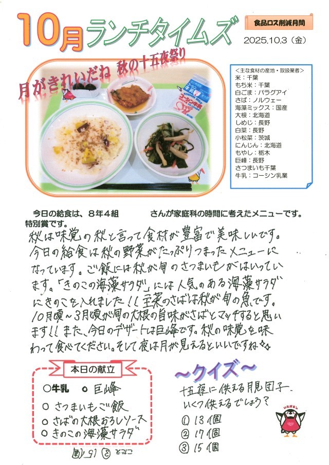 生徒作成献立「月がきれいだね 秋の十五夜祭り」