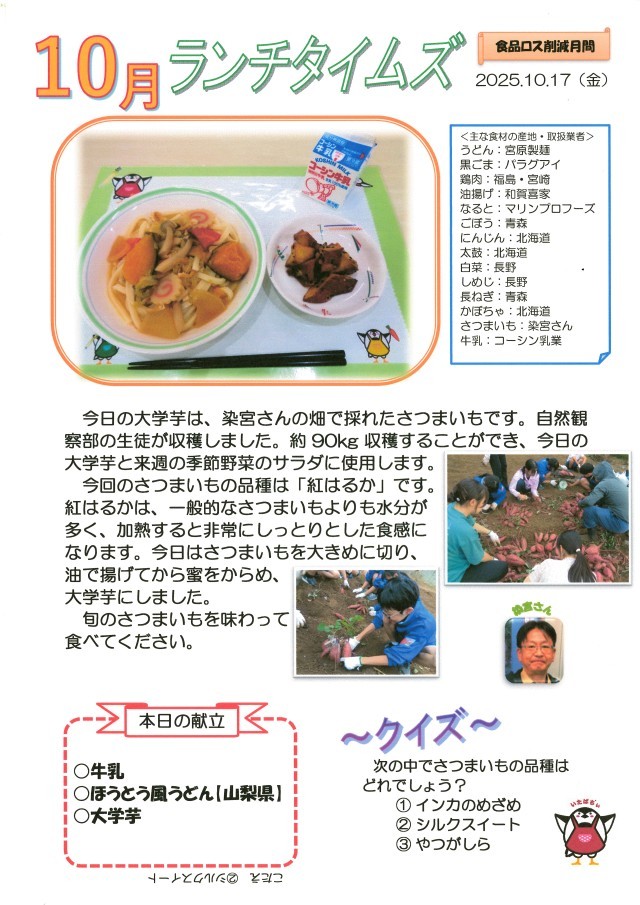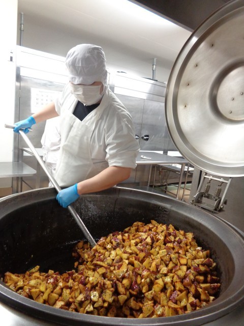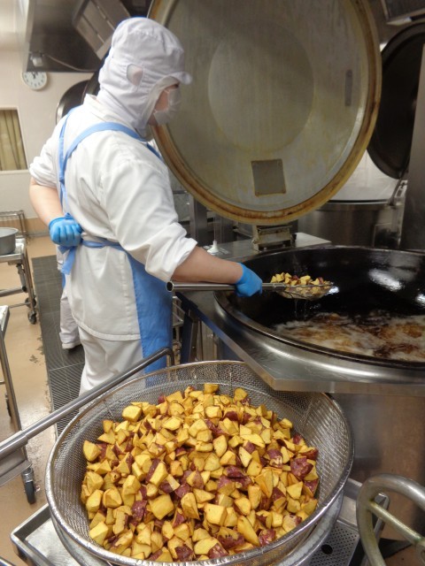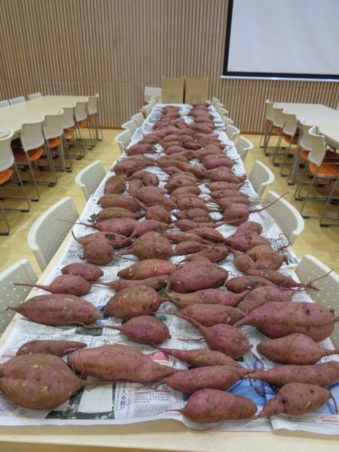 自然観察部の生徒が収穫し、多目的室で寝かせました。今回は50kgのさつまいもを大学芋にしました。