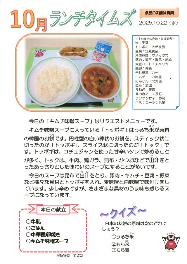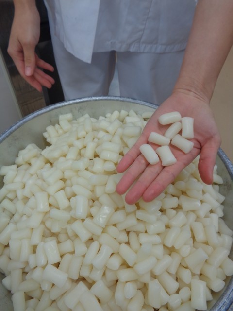 リクエストメニューの「キムチ味噌スープ」に入るトッポギはミニサイズです。