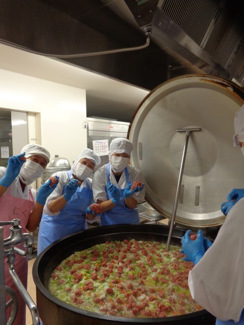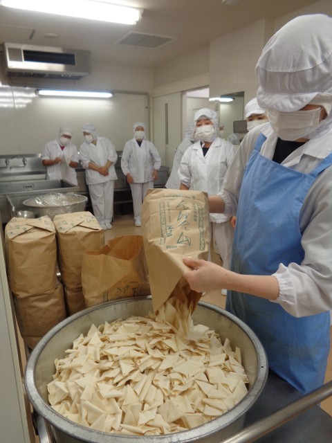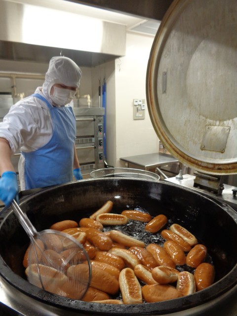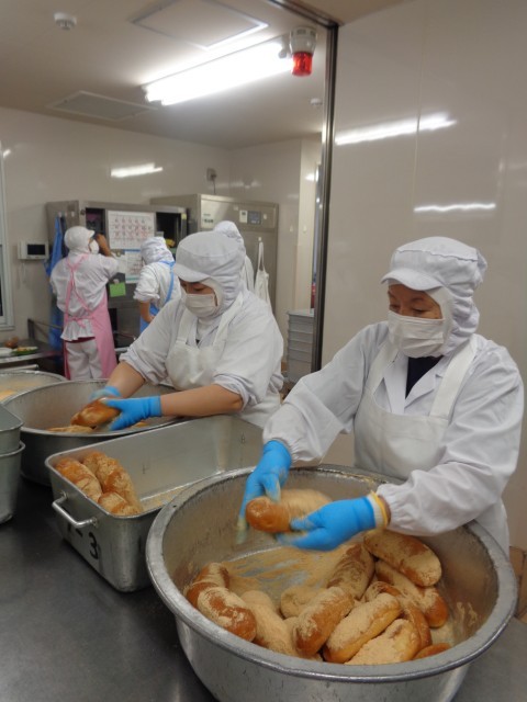 揚げパンは40個ずつ油で揚げて、きなこをまぶします。