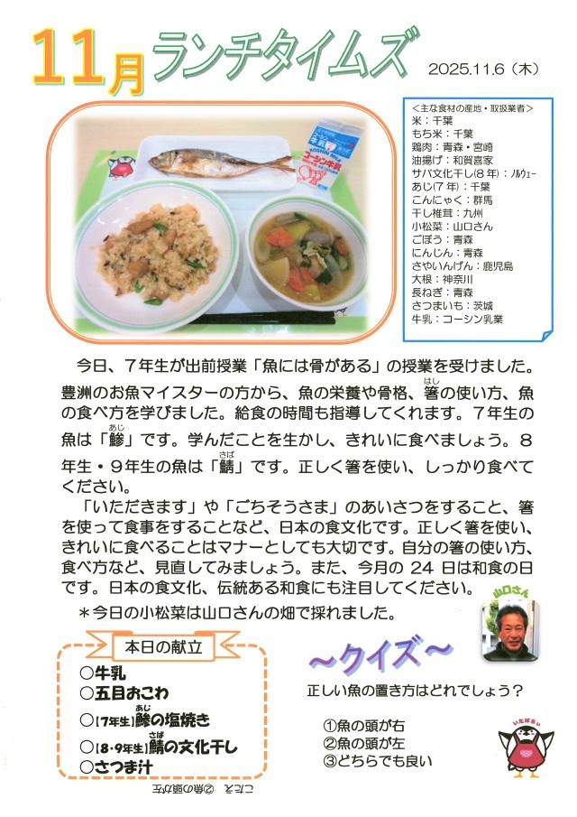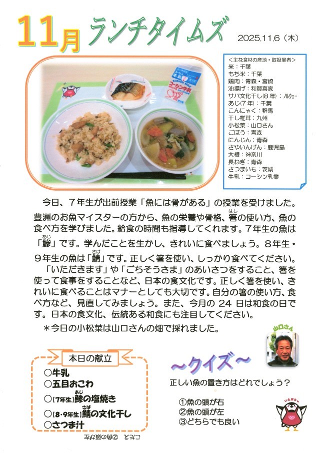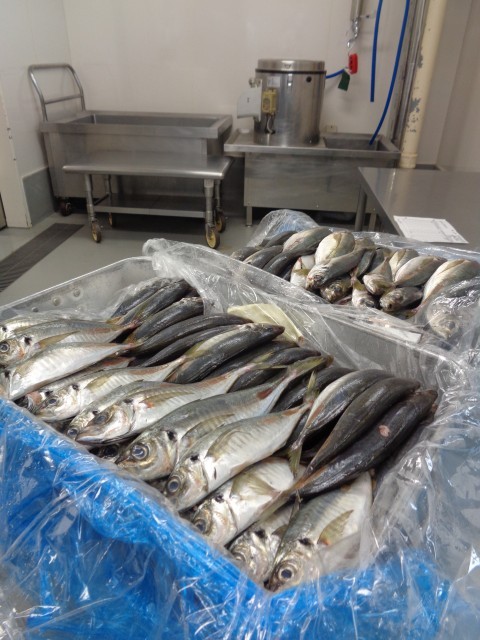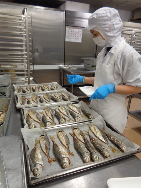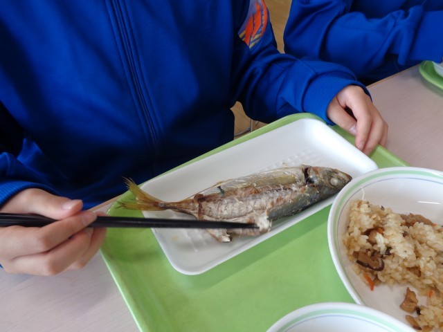 給食の時間に鯵の塩焼きを一人一尾食べました。