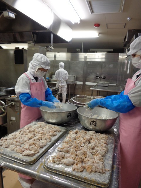下味をつけた鶏肉(1340個)に、丁寧に粉をまぶします。100個ずつ油で揚げていきます。中心温度を確認して出来上がりです。