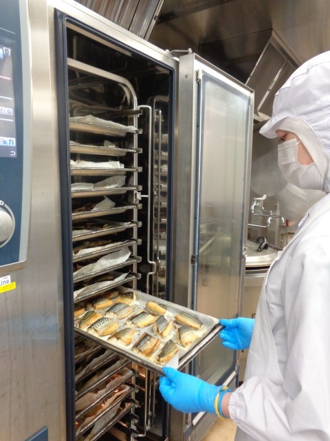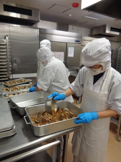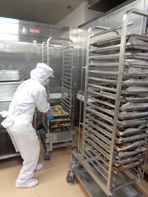 下味をつけたさばを一鉄板に18切のせ、オーブンに18~19枚の鉄板を入れて焼きます。焼き上がったさばに味噌だれをかけます。