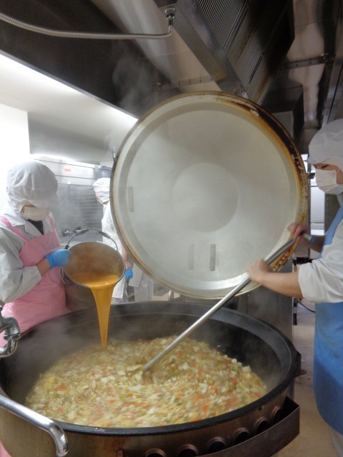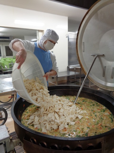 「ワンタン入り卵スープ」野菜たっぷりのスープに溶き卵を入れ、最後に乾燥ワンタンを入れて仕上げます。