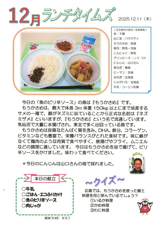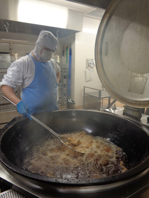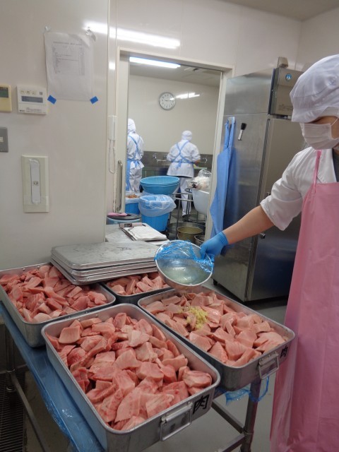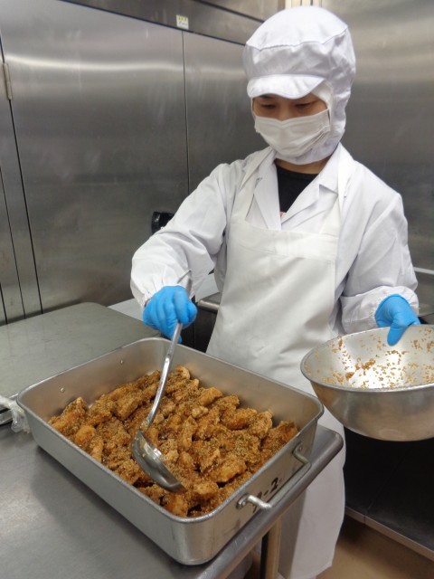 今日の魚はもうかさめです。生姜とお酒をふり、片栗粉をつけて油で揚げます。揚げた魚をクラスのバットに並べ、長ねぎやピーマン、ごまなどが入ったタレをかけます。