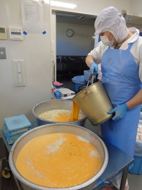 「チーズオムレツ」卵46kg(約800個)を割って、オムレツの具に合わせていきます。