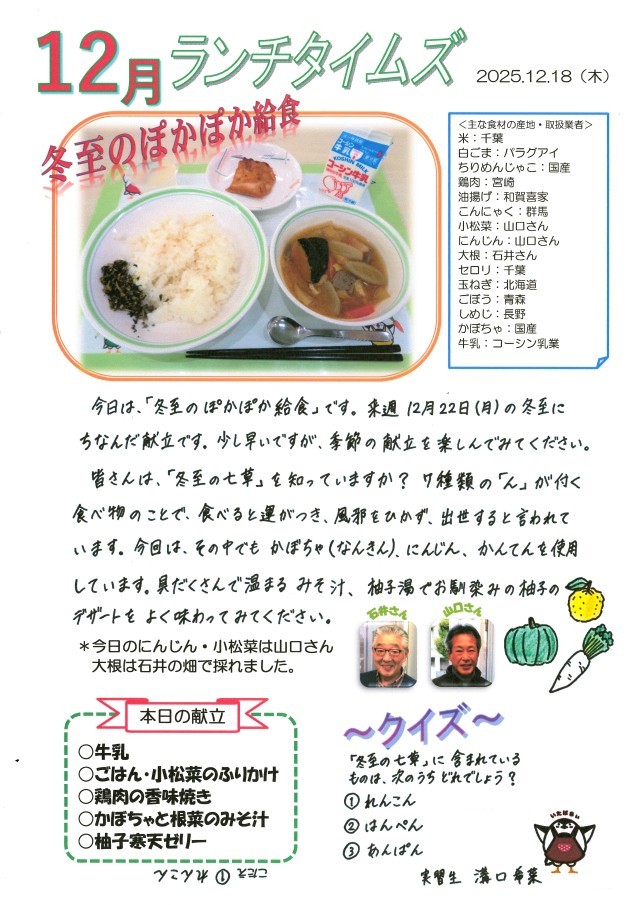 実習生作成献立【冬至のぽかぽか給食】