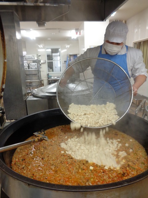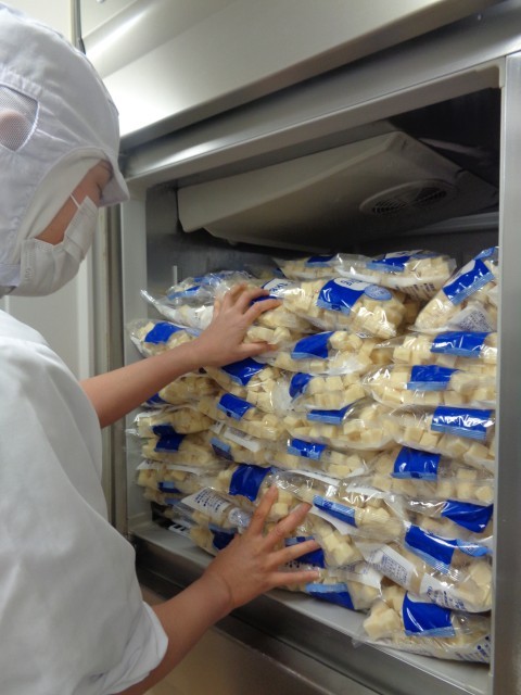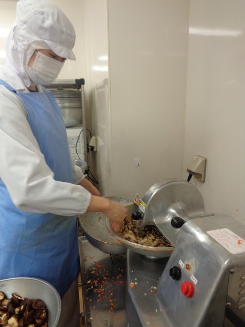 野菜のみじん切りは、みじん切り機を使用します。豆腐は冷凍豆腐72kg(およそ240丁)です。冷凍庫で保管し、ボイルしてから、最後に合わせます。