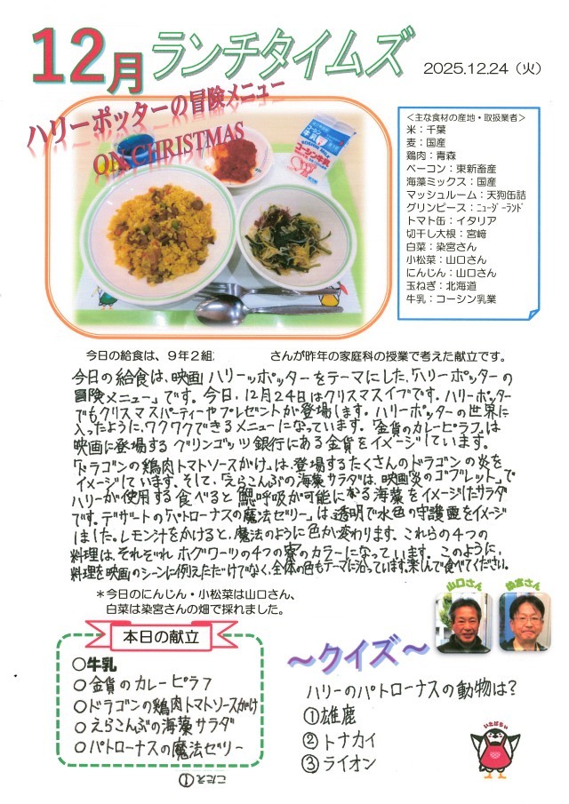 昨年度生徒作成献立【ハリーポッターの冒険メニューonクリスマス】