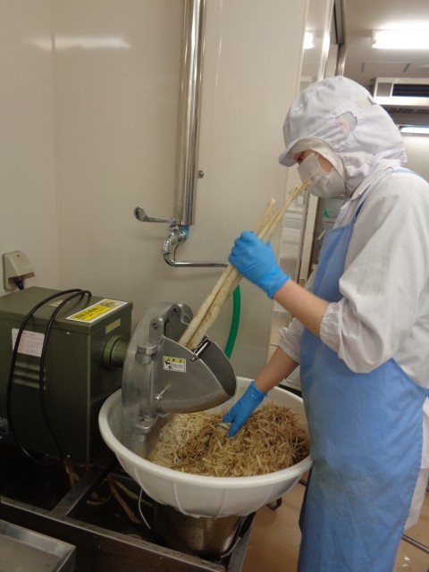 「ポテトきんぴらドッグ」ごぼうはスライサーで笹がきにします。じゃがいもとごぼうで作ったきんぴらをパンはさみます。