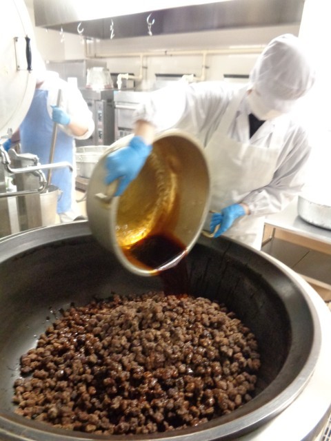 「くじらの甘辛揚げ」下味をつけ、片栗粉を付けて油で揚げます。別の鍋で作った甘辛のたれをからめます。