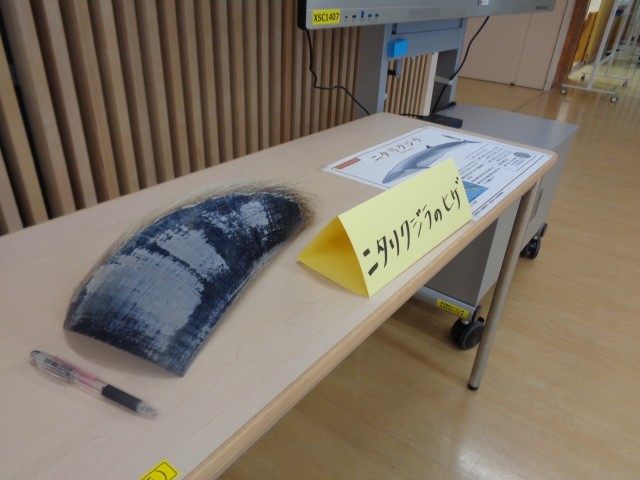 昇降口前にくじらのヒゲを展示しています。今日のくじらは「ニタリクジラ」です。