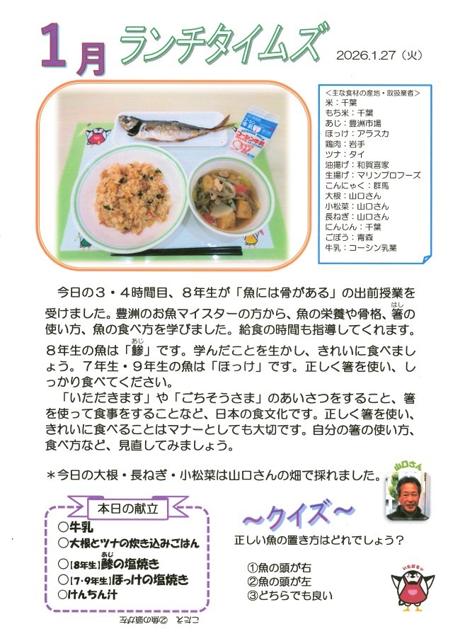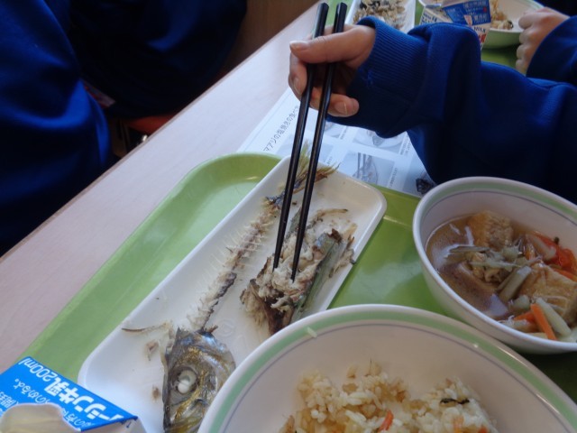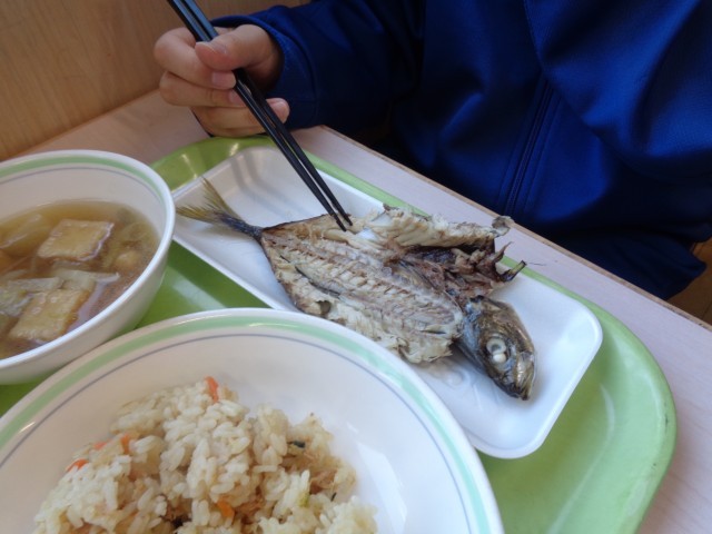 8年生は出前授業「魚には骨がある」を受けて、給食の時間にあじの塩焼きを食べました。骨に気をつけながらきれいに食べていました!