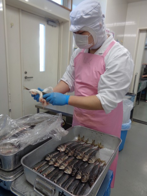8年生「あじの塩焼き」 豊洲から立派なあじが届きました。一尾一尾、丁寧にふいてから焼きます。