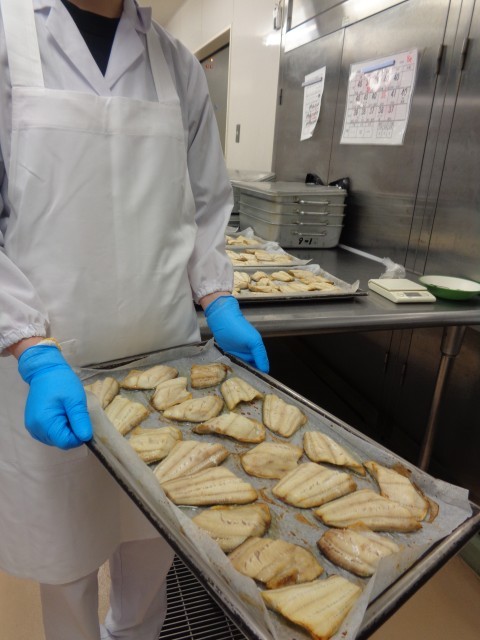 7・9年生「ほっけの塩焼き」 鉄板に並べてオーブンで焼きます。