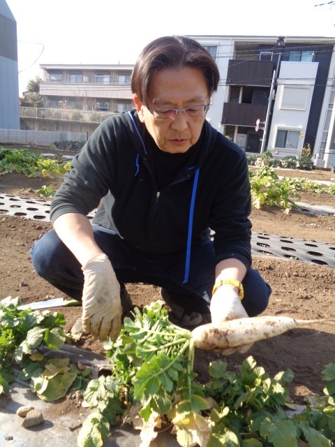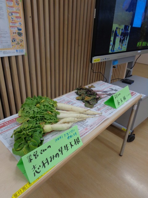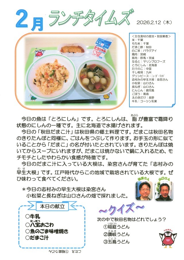 「だまこ汁」秋田の郷土料理です。今日の大根は、染宮さんが育てた志村みの早生大根です。