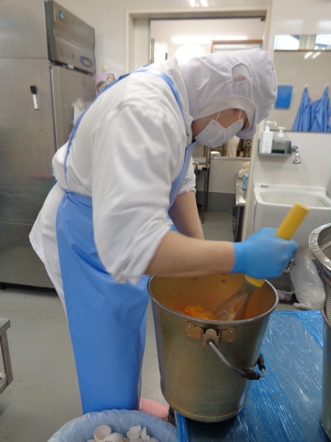 「チーズオムレツ」卵33kg(9年生給食なし)、大きな泡立て器で撹拌します。