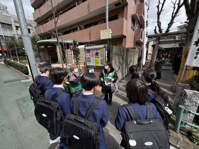 7年板橋めぐり⑧ 公開日 2026/03/06 更新日 2026/03/06 令和7年度できごと 昼食を食べ、午後の部がスタートしています。こちらは板橋エリア、縁切り榎での様子です。板橋エリアでは、各スポットで、ガイドさんに説明を受けながら回ります。