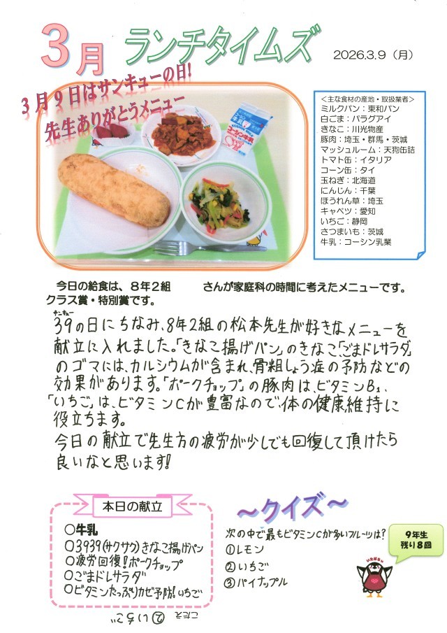 生徒作成献立【3月9日はサンキューの日 先生ありがとうメニュー】