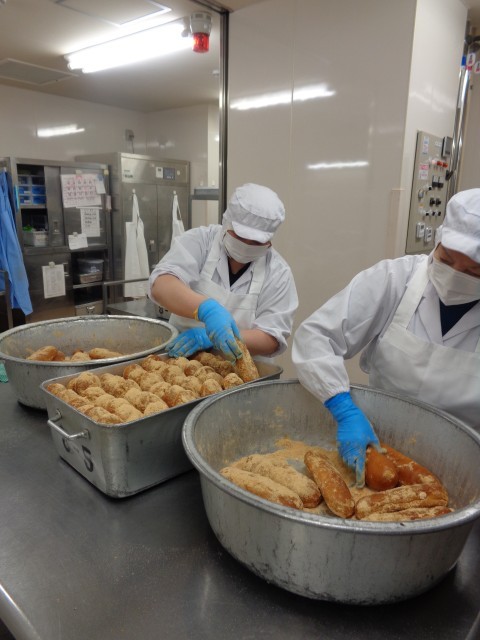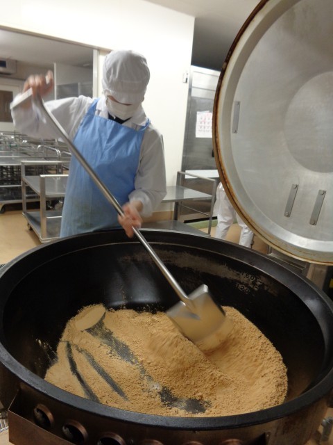 「3939(サクサク)きなこ揚げパン」きなこはから煎りして砂糖を合わせ、揚げたパンにまぶします。