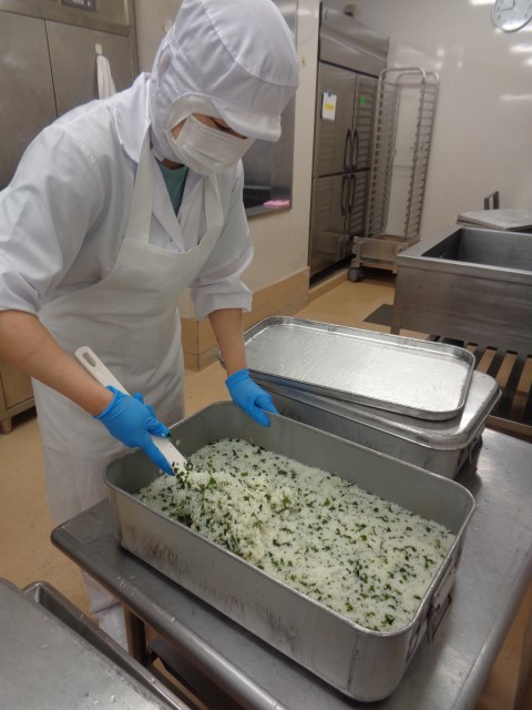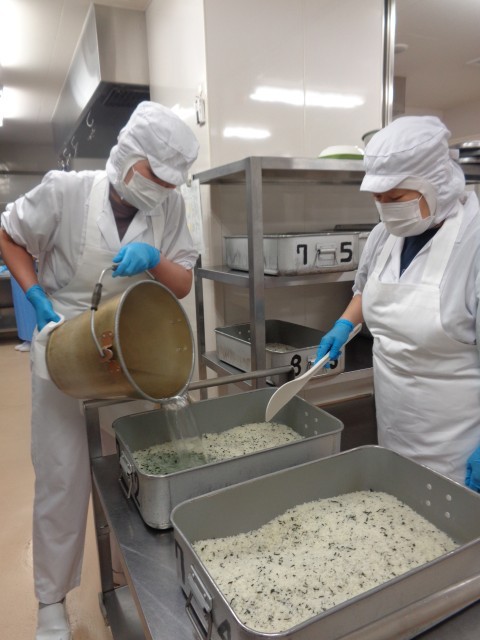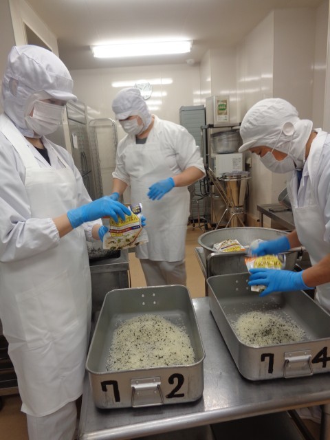 「アルファ米わかめごはん」アルファ米をクラスの人数分、ごはんバットに入れます。熱湯を入れて15分蒸らし、ほぐして完成です。