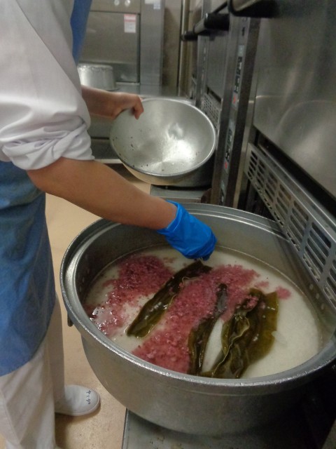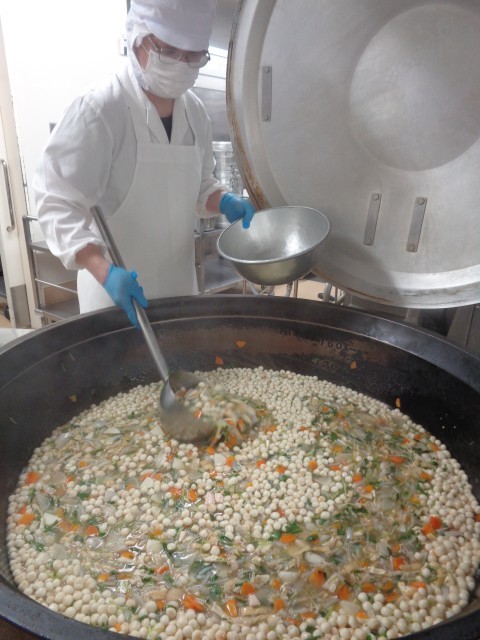 「吉野汁」今日は480人分(7年生給食なし)です。葛粉でとろみをつけて仕上げます。