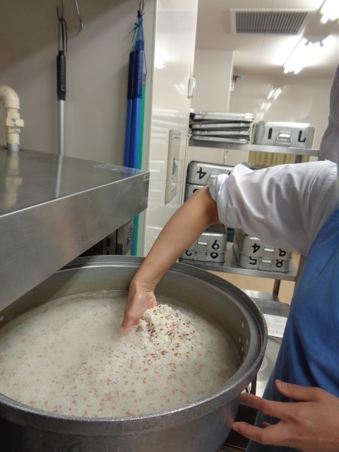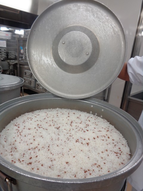 「赤米ごはん」古代米の赤米を一緒に炊き込むことで、ほんのりピンク色のごはんに仕上がります。
