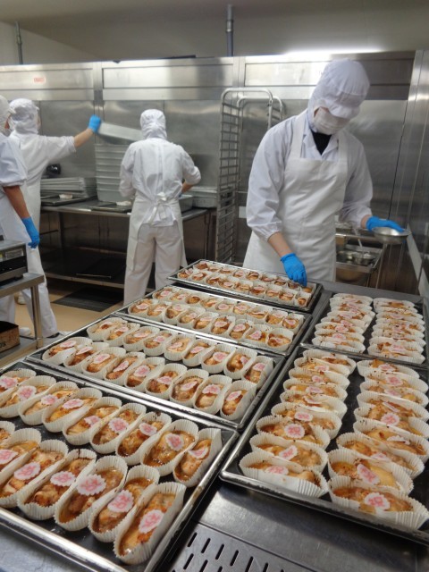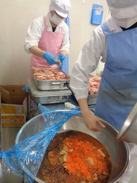 「㊗鶏肉の香味焼き」調味料に、生姜・セロリ・にんじん・玉ねぎを合わせて、香味だれを作ります。このタレに鶏肉を漬け込み、オーブンで焼きます。仕上げにお祝いなるとを飾ります。