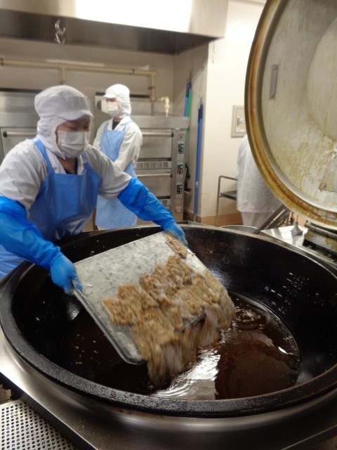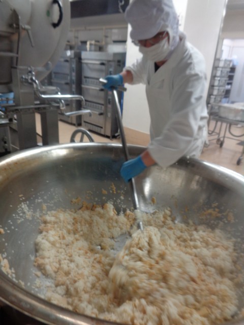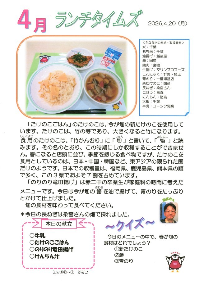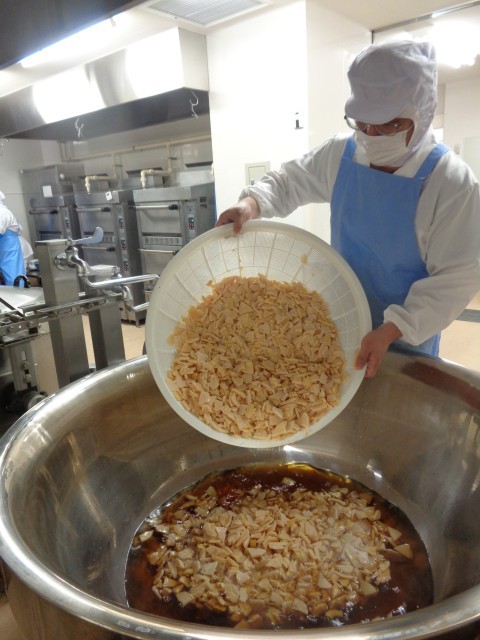 「たけのこごはん」年に一度の季節メニューです。新たけのこと油揚げを調味料で煮て、炊き上がったごはんに混ぜます。