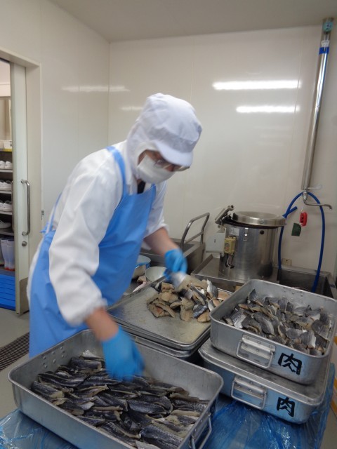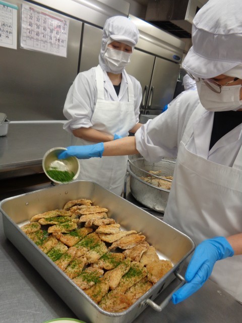 「のりのり竜田揚げ」今日は旬の鰆を使用してます。下味をつけて油で揚げ、青のりをふります。