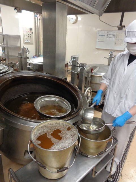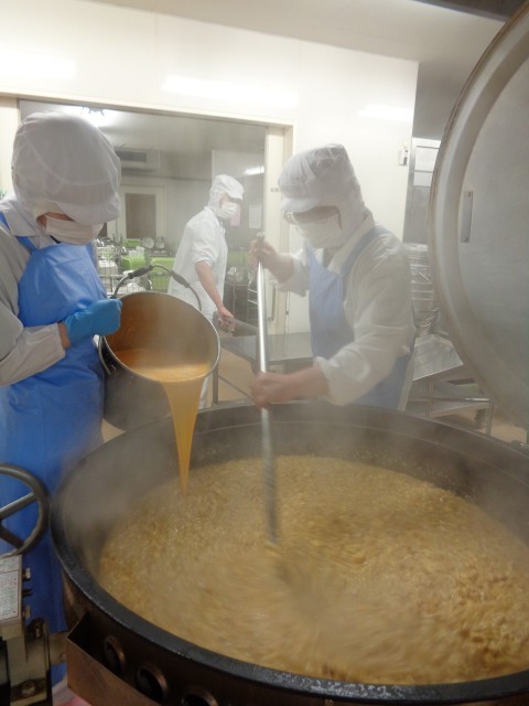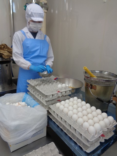 「高野豆腐入りあぶたま丼」かつお削りで出汁をとります。卵約400個、一つ一つ確認しながら割っています。最後に溶いた卵を入れて仕上げます。